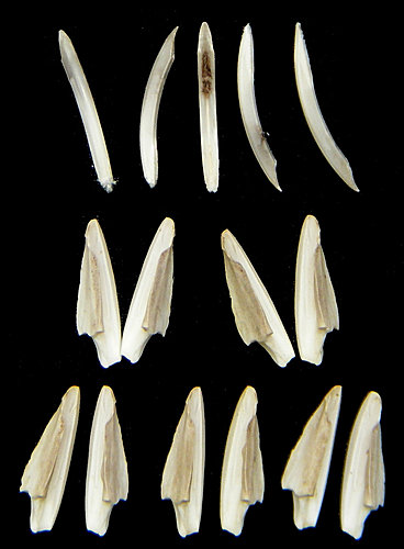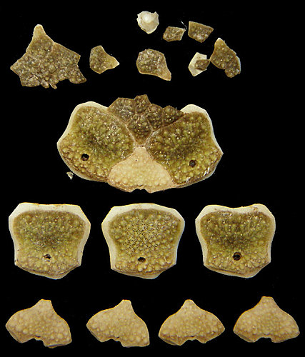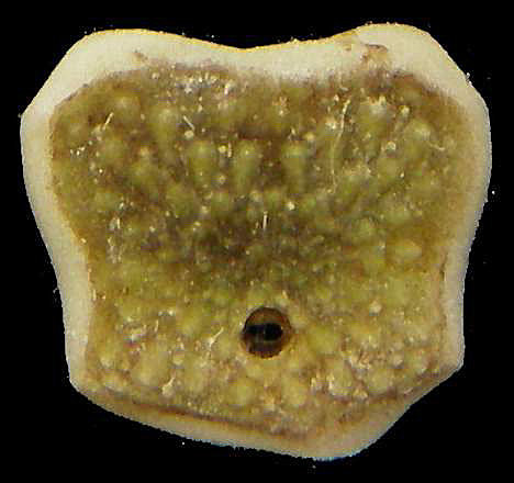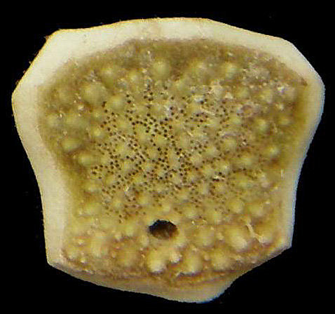 在每個半錐體(hemipyramid)的內部,有單一隻牙齒(tooth) (t) 輻射狀的鄰接在內,一般是可以透過大孔(foramen magnum)看見它的。