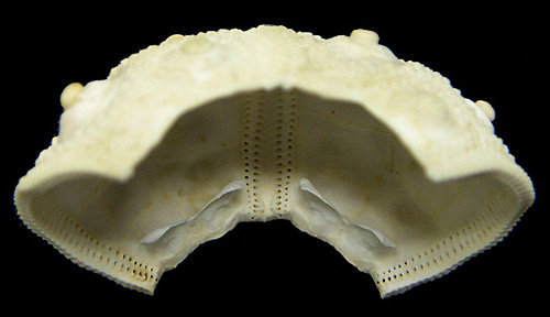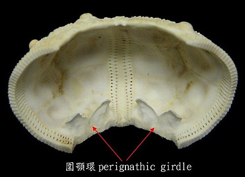 cidaroids的大孔(foramen magnum)雖小但是比起其他規則海膽而言,則屬非常深的V字型。