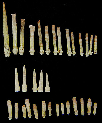 它的一級棘刺(primary spines)的領環(collar)上方的頸部(neck)為黃底加上5-6圈紅色環狀小斑點,桿部(shaft)有幾種型態: