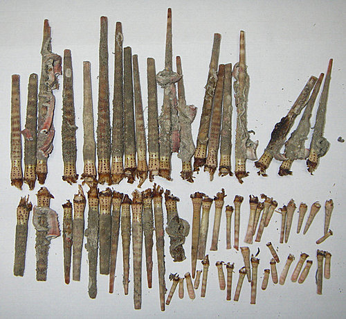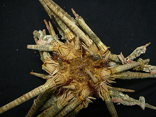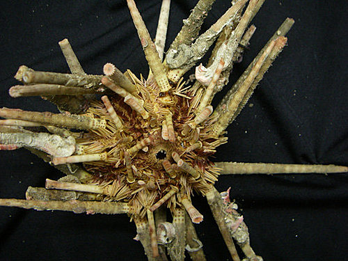 有趣的是,此顆環鋸棘頭帕海膽的棘刺上附有數隻陽隧足與不知名如氣管的東西。