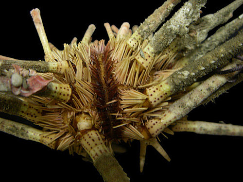 有趣的是,此顆環鋸棘頭帕海膽的棘刺上附有數隻不知名陽隧足與不知名如「氣管」的東西。↓
