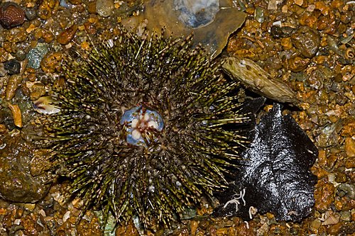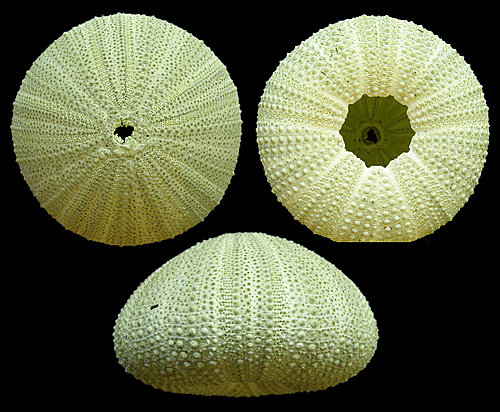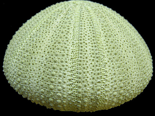 Salmacis sphaeroides雜色角孔海膽經常可以於貝殼店或海邊觀光禮品店買得到,由於其灰綠色的殼且量多而便宜,吸引人們買來當禮物或紀念品。各位如果到墾丁等觀光區,一定可以看得到,甚至可能是你第一個買到的海膽收藏品。 Test體殼:雜色角孔海膽,殼高從扁平低矮的半球形,到高到呈錐狀都有可能,故其體殼變異極大。口面平坦,殼徑可達10公分左右。 Apical system(頂系):頂系為dicyclic型態,肛圍很小,約只佔殼體的1/8,,除了篩板之外,其他骨板上密佈著小疣,肛圍板細小。 Ambulacra(步帶區): Pore-pairs緻密,每組「對孔弧」以3對向外向下斜走呈現,最外面的Pore-pairs並不靠近步帶區最外緣。每塊步帶板有3個對孔與4-5小疣交錯並列在外側,而2個有細齒的大疣並列在內側,每塊步帶板縫合處的angular pits還算顯著可見;這2個有細齒的大疣在反口面最小,在ambitus處與口面最大,與間步帶區的大疣差不多大。 Interambulacra(間步帶區):間步帶區的每塊間步帶板中央有1列大疣規則排列,左右邊伴隨數個小疣,於ambitus處的小疣個數最多同時也與中央的大疣差不多大小,於反口面每塊間步帶板幾乎都有大小差不多3個大疣並列,然後在接近口圍處中央大疣旁的疣又陡然收縮成小疣。 Peristome口圍:口圍凹陷並有顯著的buccal notch,直徑約為口面直徑的1/3-1/4。 Spine棘刺:間步帶的大棘短而細,整齊地排成兩列;口面的大棘變得較為寬而扁。 Color顏色:本種活體的顏色變異極大,從近乎白色到墨綠色都有,大棘在綠色的底色上有紅褐色、紫色、白色或綠色的環帶。裸殼為灰綠色,有時有些或深或淺的輻射狀色斑。 Biology生物特性:大多棲息在低潮線附近的珊瑚礁區的沙底或海草中。牠們經常會用海藻或海草的葉片以及貝殼碎片遮蓋體殼以偽裝掩蔽自己,研究顯示本種為雜食性的海膽,牠們會捕食所有捉得到的底棲生物,包括軟體動物、各種蟲類,以及藻類等。 Distribution分佈:分布於香港到所羅門群島間的海域,以及澳洲的北部與東部沿海。雜色角孔海膽棲息於潮間帶到水深數公尺的淺海,偶而可達50公尺左右的深度。台灣目前僅知道有出現於墾丁海域的紀錄。 參考資料: 1. Sea Urchin P164 2. 自然與人文數位博物館 -棘皮動物典藏知識單元