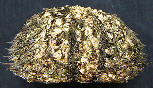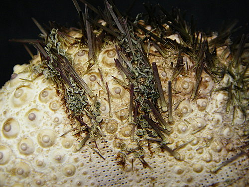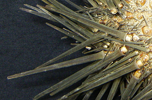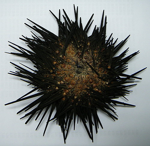 Spine棘刺:其棘刺粗糙如砂紙,感覺如同鉛筆蕊心且輕脆易斷,往外逐漸縮小但末端鈍,顏色呈黑色或紫黑色,在水中會卻會反射出墨綠色的螢光;外形與紫海膽相似,但紫海膽的棘刺則觸感光滑,呈紅黑色。反口面的棘刺較粗壯,其長度約為殼直徑的一半,而口面的棘刺比較短細。