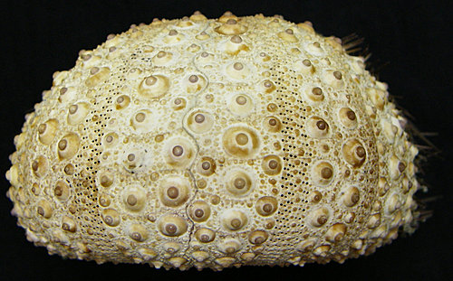 Test體殼:體殼的輪廓,由反口面俯瞰接近圓形或五角形,側面呈厚外圍的半球形,殼高約為殼直徑的1/2,口部周圍幾乎不凹陷地平坦,直徑通常為6~8公分,但也可達11公分以上。
