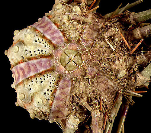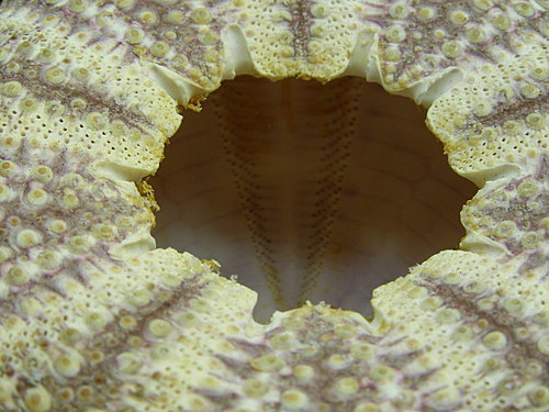 種 名 殼體的特性 australis 殼體接近圓形,間步帶區中央裸露處短而狹窄,呈現淡紫色調的鋸齒狀邊緣。紫色鋸齒狀的正中線從生殖板開始往下延伸至赤道區上方才停止,而其外緣由紅色帶狀包圍。 exquisitus 殼體接近圓形,間步帶區中央裸露處較為寬廣,邊緣處也較直,呈紫色帶狀,中央有淡紫色鋸齒狀線從生殖板一路往下延伸至赤道區,而其外緣有橘色帶狀包圍,並一直往下延伸至殼體下緣。 floridanus 殼體接近圓形,間步帶區中央裸露處寬廣,邊緣線直而整齊,呈奶油色帶狀,中央有淡紫色不明顯的鋸齒狀線從生殖板延伸至赤道區,而其外緣有橘紅色邊緣包圍,但並不延伸至赤道區。 granulatus 殼體接近圓形且顯著的脹出,間步帶區中央裸露處中度寬廣,邊緣處稍微呈鋸齒狀,呈紫色帶狀,中央有鋸齒狀淡紫色線從生殖板往下延伸至赤道區上方,而其外緣有紅色帶狀包圍,並一直往下延伸至殼體口面。 interruptus 殼體接近圓形,間步帶區中央裸露處較為寬廣,邊緣處也較直,呈棕色帶狀,中央有淡紫色鋸齒狀線從生殖板往下延伸至赤道區,而其外緣有白色帶狀包圍,並一直往下延伸至至赤道區。其步帶區中央與鄰近區為紅色。 longicollis 殼體接近圓形且反口面較扁平,間步帶區中央裸露處中度寬廣,邊緣處呈鋸齒狀,呈奶油色帶狀,中央有鋸齒狀紫色線從生殖板往下延伸至赤道區上方,而其外緣有紅色帶狀包圍,並延伸至赤道區。 maculatus 殼體接近圓形,間步帶區中央裸露處短而狹窄,稍呈鋸齒狀的正中縫合線行走其中,而其外緣由紅色帶狀包圍直到赤道區。 maillardi 殼體接近五角形,反口面步帶區顯著地突出,而間步帶區中央裸露處寬廣,呈現棕色或紫色調,邊緣顏色較淡,而其外緣由紅色直條帶狀包圍。淡紫色鋸齒狀的線從生殖板開始往下延伸至赤道區下方。 undulatus 殼體間步帶區中央裸露處非常狹窄,只有一條裸露的淡紫色鋸齒狀線條,從生殖板開始往下延伸至赤道區上方。而其外緣由許多短球棒狀的二級棘刺與針狀粟粒棘刺包圍。外緣的底部顏色為紅棕色並分布於整個間步帶區直到赤道區才停止。 undulatus var. polymorphus 殼體接近圓形,間步帶區中央裸露處較為狹窄,鋸齒狀邊緣,呈紫色帶狀,中央有淡紫色鋸齒狀線從生殖板往下延伸至赤道區,而其外緣有紅色帶狀包圍,並一直往下延伸至至赤道區。殼體步帶區為帶粉紅色調的奶油黃色,間步帶區為紅色。 undulatus var. ruber 殼體接近圓形,間步帶區中央裸露處寬度中等,邊緣筆直,此裸露處為紫色,中央有淡紫色鋸齒狀的線條,於幼體時從生殖板開始往下延伸至赤道區,成體則只有至赤道區的前3/4。外緣為深紅色直條帶狀,但於裸殼則較不明顯,因為整個殼體除了其大疣為奶油黃或白色,皆呈現紅色。 vittatus 殼體接近圓形,間步帶區中央裸露處寬,邊緣筆直,此裸露處為淡棕色,中央有淡紫色鋸齒狀的線條從生殖板開始往下延伸至赤道區,外緣顏色較淡並延伸至赤道區下方。步帶區中央與足孔周圍為紅色。