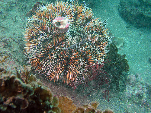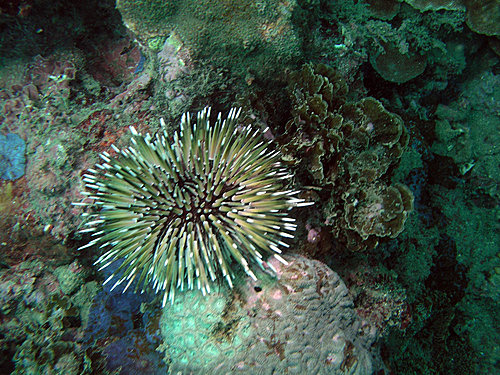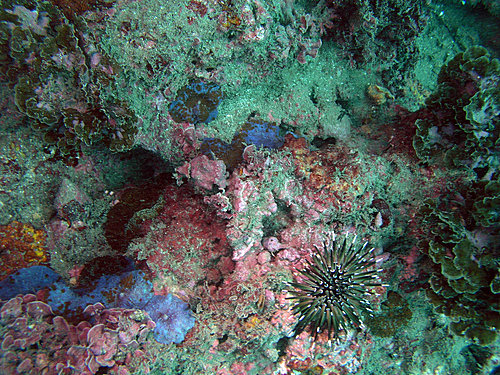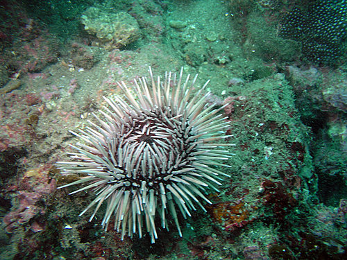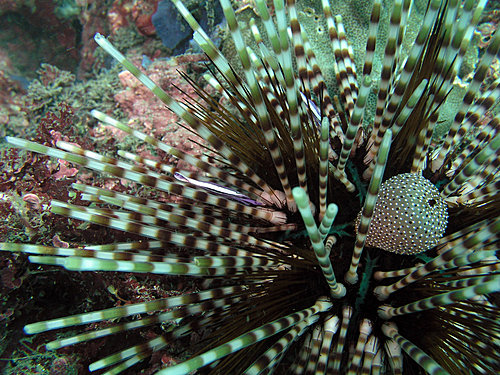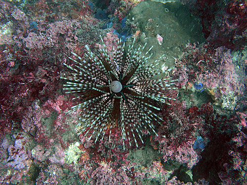 後來在回程時Darren在珊瑚礁岩穴中發現一顆非常漂亮的環刺棘海膽(Echinothrix calamaris),