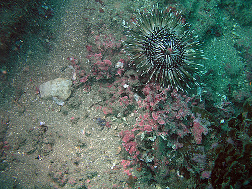 水況不是很好,浪很大,所以能見度不佳,不過運氣還真的不錯,惠民兄首先發現一顆巨大的馬糞海膽 (Tripneustes gratilla 白棘三列海膽),約12公分大,殼體還綴有許多偽裝物包括海草與破貝殼,如果是平常風平浪靜時應該很難發現牠的存在,但因當時浪大,所以牠被浪推著往前滾動,因此暴露了牠的行蹤,由於浪大所以很難好好地為這位麻豆照相,經過仔細觀查牠的外觀可發現牠管足有兩類,綠色指狀的管足與下端黑咖啡色、上端白色、末端為盤狀的管足,反口面布帶區佈滿密密麻麻綠色指狀管足,夾雜一些上端白色盤狀的管足,然而口面與赤道區的步帶區的盤狀管足量增加許多,綠色指狀管足較少,使得上端白色盤狀管足顯得較顯著。不同類型管足在不同面的比例的大不相同,意味著白色盤狀管足可能的主要功能為爬行移動與固定殼體於礁石或將食物移動到口部,而綠色指狀管足可能的主要功能為呼吸。當然這樣的推論的基礎很薄弱,還須更進一步的觀察與實驗。由於波浪洶湧很難好好地仔細觀察,所以有待下回的再次相會了。