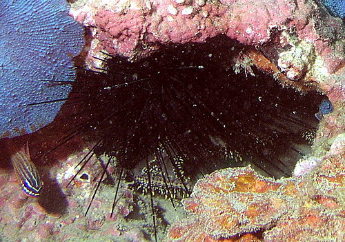形態特徵: 分布於水深0~30公尺的礁岩區,以及珊瑚礁區的潮池或低潮線附近亞潮帶的岩石下。此種海膽具有特殊的肛乳突,肛門就開口在金黃色亮圈的中央,利用這樣的構造,牠們可以將排泄物排放得高一點、遠一點,以免被自己細長的棘刺給卡住。身上反口面有5個輻射對稱白色或藍色的醒目斑點。體殼直徑可達10公分以上,牠們的大棘細長而尖銳,一般為黑褐色,長度可達15~20公分左右,加上海水在視覺上的放大作用,因此常有人宣稱看到比籃球還大的魔鬼海膽。由於棘刺尖細且有毒,而且每一枚刺皆由無數的小箭頭所組成,因此對人的殺傷力極大。本種的主要食物是海底的大型藻類,如石蓴、紫菜等。白天大多藏在岩穴中,晚上才會外出攝食,以銳利的牙齒刮食海藻。本種在台灣南部的生殖季節約在七月左右,有成群出現的情形。