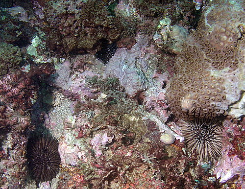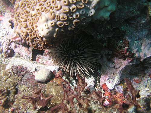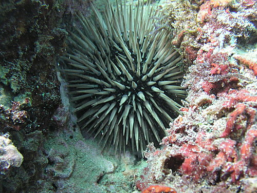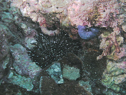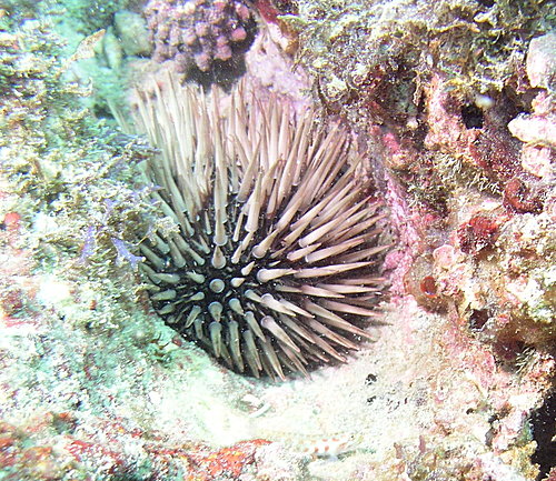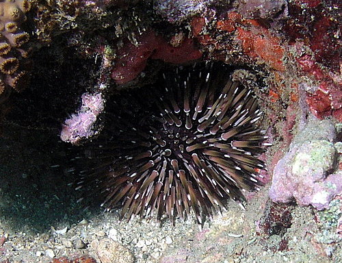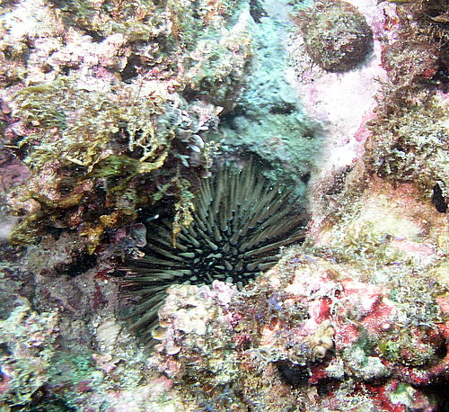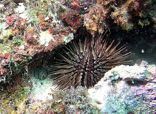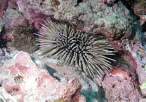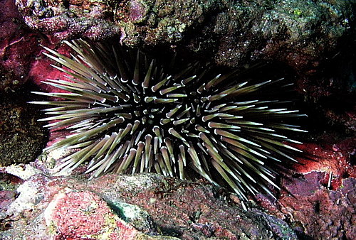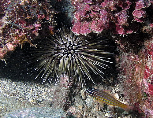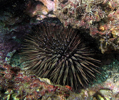 形態特徵: 梅氏長海膽由潮間帶到水深5公尺左右的亞潮帶都常可見到,但以低潮線附近的碎浪區最為常見。此海膽體殼為長橢圓形,長徑5公分以下。棘刺粗短不具毒性,呈圓錐形,其上有縱肋。體色個別差異大,以棕、黑色為主。棘色有紅棕色、黃綠色、白色等不一而足。具有堅硬的棘刺,可以將礁石及水泥消波塊磨出一道道長條形的凹槽躲藏其中。由於牠們的體殼略呈長形,酷似以前養豬用的飼料槽,因此被稱為“豬槽海膽”。此種海膽會用棘刺在珊瑚礁或岩礁上磨出洞穴躲藏,岩石那麼硬,梅氏長海膽的刺怎麼可以挖出一個洞來。海洋生物學家發現梅氏長海膽平時會分泌酸,這些酸會慢慢侵蝕岩石。珊瑚礁的成份主要是碳酸鈣,碳酸鈣很容易受到酸侵蝕。再加上許多棘刺的挖鑿作用,隨著海膽身體的成長,這些洞就愈來愈大。牠們似乎整日皆侷限於自己所挖的凹槽中活動,並不離開巢穴,有固定棲所的習性,其刺棘長度常與所居的岩穴大小配合。以攫取漂流到巢穴的藻類碎片為食。