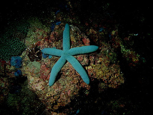 形態特徵: 最常見的大型海星,腕長可達15公分左右。一般個體有5隻腕足,偶有四隻腕足的個體,體色呈淺藍色或寶藍色,但偶有呈紫藍色或橙黃色的個體直徑約16~40公分。腕足細長呈指狀,長短不等,外半段常略膨大。反口面骨板很多,為大小不一的圓或橢圓形,排列無規則。本種是熱帶珊瑚礁內常見而著名的海星,牠們通常出現在礁岩及珊瑚礁區的潮池或亞潮帶水深數公尺的淺水處,潛水時經常可見牠們在沒有掩蔽物的礁石上,將胃外翻消化底質上的藻類及其它有機物。