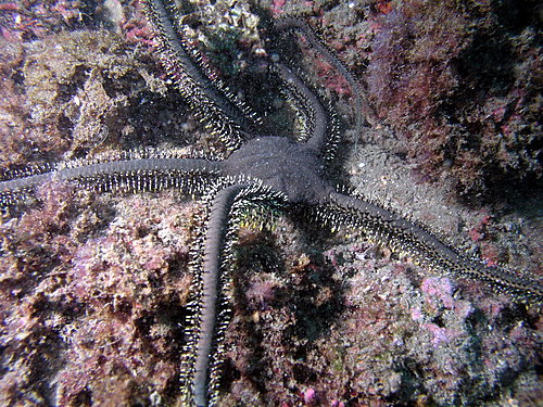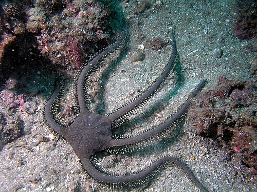 形態特徵: 分布於礁岩區0~97公尺深的淺海,為台灣最大型的陽燧足,中央體盤呈五角形,直徑可達約3~5公分,體盤的反口面覆蓋許多顆粒狀突起,為灰綠色不規則的鑲黑邊小白點,腕足五隻由似蛇腹之櫛片串成,長約15公分。本種的體色一般為橄欖綠色或綠褐色,但有些個體會變為橙色,腕針與體色但針尖多為黃色。通常棲息在礁石區水深2~5公尺左右的岩塊下,在生殖季節時有群集的行為。為雜食性以碎屑為食,但以肉食為主要的食物成份。