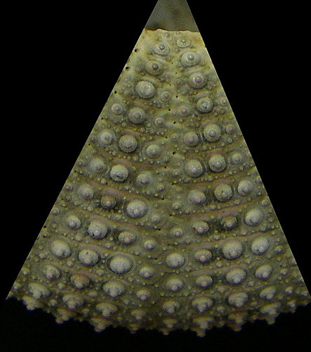 Ambulacra(步帶區):體殼步帶區上的大疣非常的整齊排列在管足孔邊,小疣排列較不整齊,但於ambitus區域則明顯變得與大疣相當,大疣的細齒明顯而無穿孔,步帶板縫合處的angular pits顯著可見。每組「對孔弧」以3對一組呈現向外向下斜走,上下大疣間有一顏色較白、稍微突起的半菱形狀斑塊將上下大疣明顯的隔開。骨板的上下緣,具有水平走向的凹溝。