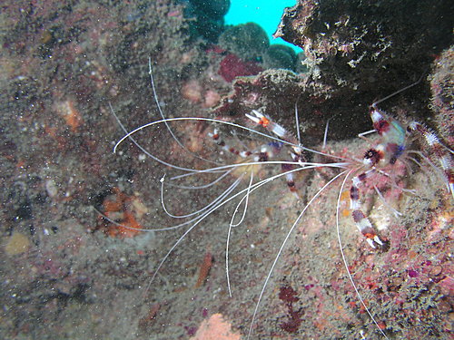 形態特徵: 日本人稱其為「姬蝦」,因為其形態及動作優雅,如穿梭在珊瑚礁間的歌舞姬一般。大螯及身上有紅白相間的顯眼橫紋,並有三對醒目的白鬚,體表佈滿細棘,頭胸甲幾乎成透明狀,母蝦在體內帶卵時,可看見明顯的藍綠色團塊。在臺灣及離島各地的淺海珊瑚礁區洞穴中常見,雄蝦有極強的領域性,據報導有替魚類清除寄生蟲的「清潔行為」,屬於「清潔蝦」的一種。本種通常棲息在珊瑚礁海域的潮池及3~5公尺水深的淺海陰暗的岩壁上或岩洞中,廣泛分佈於阿拉伯海、澳洲、日本、臺灣及菲律賓海域。