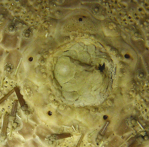Apical system(頂系):屬dicyclic type,肛門偏離肛圍的中點,約偏離半徑的一半。些許往上突出,生殖板內部佈滿小疣環繞著肛圍,外部則無任何小疣,而眼板則密佈小疣。肛圍由許多小骨板堆疊而成。篩板上佈滿甚多小篩孔。