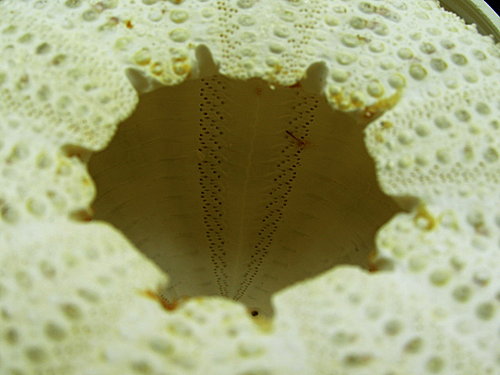 Pseudoboletia maculata 斑蘑海膽 81.1x 33.6mm , aboral view, apical system, close-up.