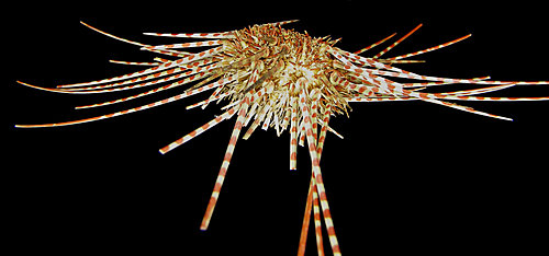 口面有許多蛇頭叉棘 Ophicephalous pedicellariae are abundant orally. The spine's collar has longitudinal ridges ventrally. 一級棘刺腹面有縱脊。