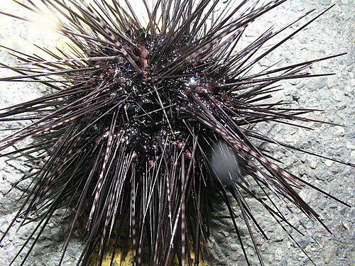 最後還是發現了一隻Diadema savignyi 沙氏冠海膽,因為海況不適合攝影,只好撈到岸上才能拍照,以下為上岸後的照片.