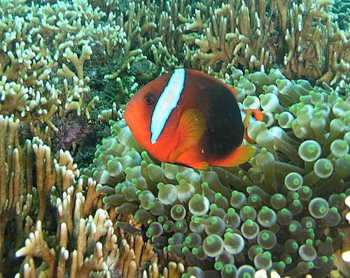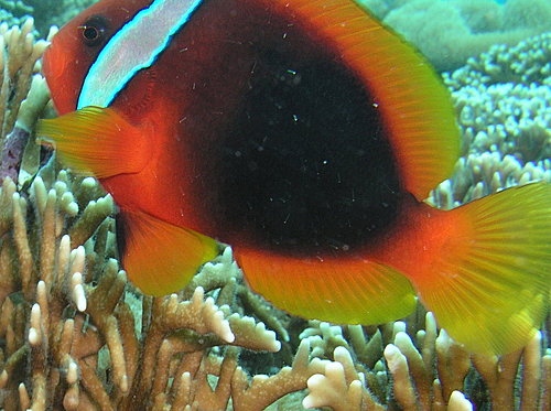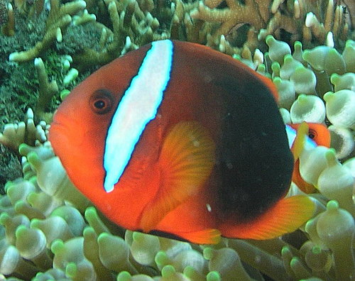 Common name: Red tomato clown; Onebar anemonefish; Red clown; Tomato anemonefish; Tomato clownfish; Blackback anemonefish; Bridled anemonefish; Fire clown