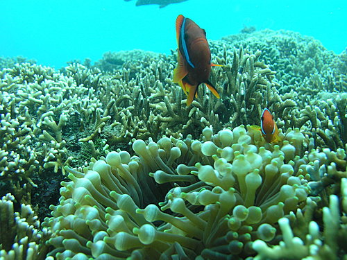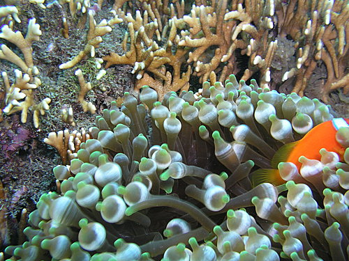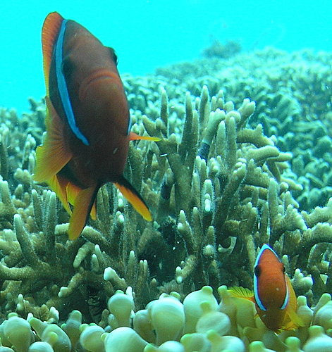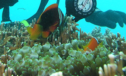 Symbiosis with Entacmaea quadricolor。 與Entacmaea quadricolor 四色篷錐海葵共生。