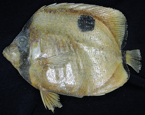 Description:Yellow teardrop butterflyfish. Fish taxidermy. Preserved using formalin, taken with tangle net in Caubian Island, Cebu, Philippines.