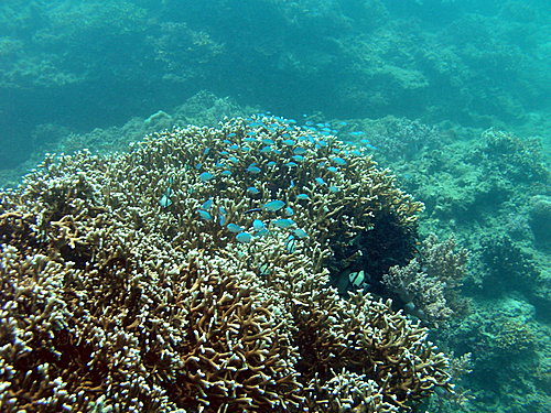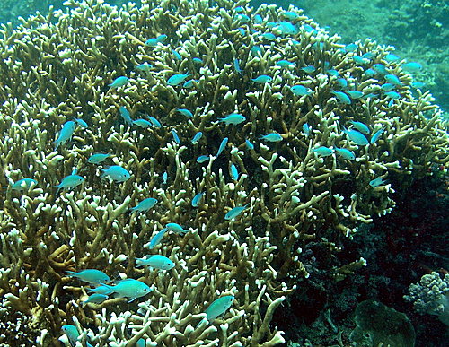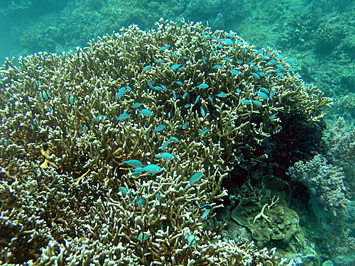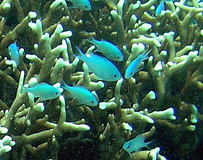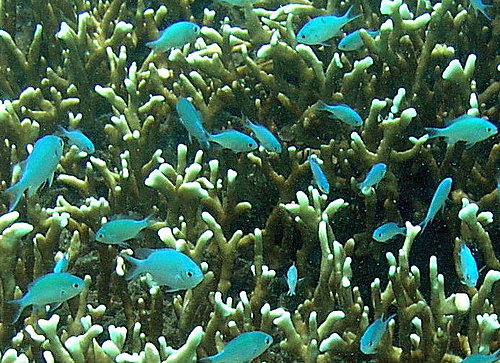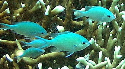 Description: Blue-green puller; Blue green chromis; Blue green damselfish; Blue-green chromis; Green damsel