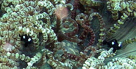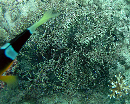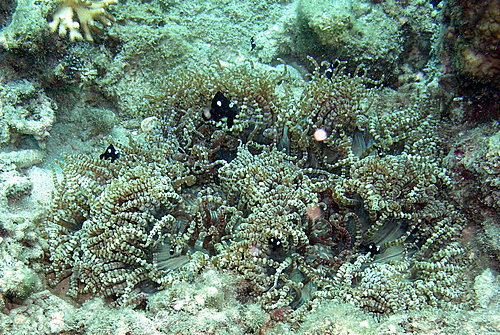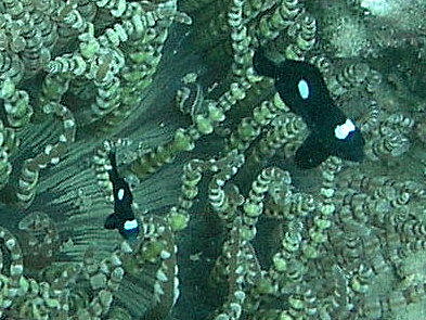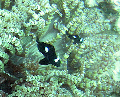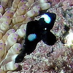 Description: Threespot damselfish; Three-spot damsel; Three-spot dascyllus; Three spot damsel; Whitespot humbug; White-spot puller; Threespot dascyllus; Three spot dascyllus; Three spot damselfish; Domino; Domino damselfish