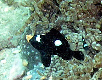 形態特徵: 體呈圓形而側扁,標準體長為體高之1.4-1.6倍。吻短而鈍圓。口中型;兩頜齒小而呈圓錐狀,靠外緣之齒列漸大且齒端背側有不規則之絨毛帶。眶前骨具鱗,眶下骨具鱗,下緣具鋸齒;前鰓蓋骨後緣多少呈鋸齒。體被櫛鱗;側線之有孔鱗片17-20個。鰓耙數23-25。背鰭單一,軟條部不延長而呈角形,硬棘XII,軟條14-16;臀鰭硬棘II,軟條13-15;胸鰭鰭條18-21;尾鰭內凹形,上下葉末端略呈圓形。體色呈暗褐色到黑色;體側中央兩側具一淡色斑點,頭背上另有一淡色斑點。幼魚時體色暗,斑點泛白;隨著成長,體色漸淡,斑點亦變淡,甚至消失。 幼魚常與小丑魚一起與海葵、海膽共生或在珊珊叢中棲息,成長後以珊瑚礁為主要棲息場所。領域性極強,在警戒或交配時,體色會轉變成灰白色。