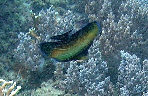 形態特徵: 體略高而呈卵圓形;背部輪廓略突出,頭背於眼上方平直。吻鈍而小。眶前骨寬突,不游離;前鰓蓋骨後緣及下緣具弱鋸齒,具一長棘;鰓蓋骨後緣平滑。體被小型圓鱗,腹鰭基底具腋鱗。背鰭硬棘XIII,軟條20-22;臀鰭硬棘III,軟條20-21;背鰭與臀鰭軟條部後端尖形,略呈絲狀延長;腹鰭尖,第一軟條延長,達臀鰭起點;尾鰭鈍圓形。幼魚體一致為深藍色,體具若干白弧狀紋,隨著成長白弧紋愈多;中型魚體前後部位逐漸偏褐色,中央部位偏淡褐色,弧紋亦逐漸消失;成魚體呈黃褐色至暗褐色,體側弧形不顯,取而代之的是散佈許多暗色小點,前鰓蓋骨及鰓蓋骨後緣具藍紋,上下頜黃色,各鰭緣多少具藍緣,亦具藍色或白色小點。