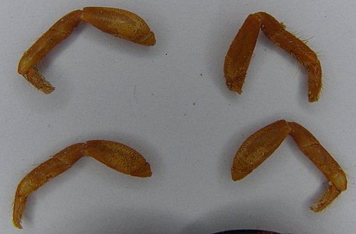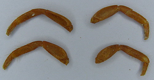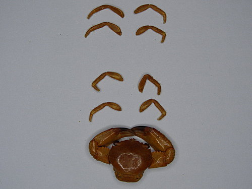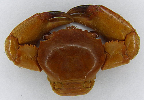 型態特徵:頭胸甲近梯形,扁平光滑,分區不可辨,自胃區兩側至側齒間各有橫列紅斑,胃區正中央具一對斑點。額緣突出,分四葉,頭胸甲側緣中央具一銳刺。全身橘紅色。螯足粗壯,左右不等稱,表面光滑,,兩螯可動指弧形下彎溝狀,不動指末端尖銳上彎,兩指間合攏時交叉,步足光滑,指間彎鉤狀;螯足指部末3/4深褐色至黑色,掌部背面具深紅色不規則斑紋。掌節長,腕節及掌節外側面具絨毛,腕,前節具稀疏剛毛,指節剛毛較密,指尖彎鉤狀。