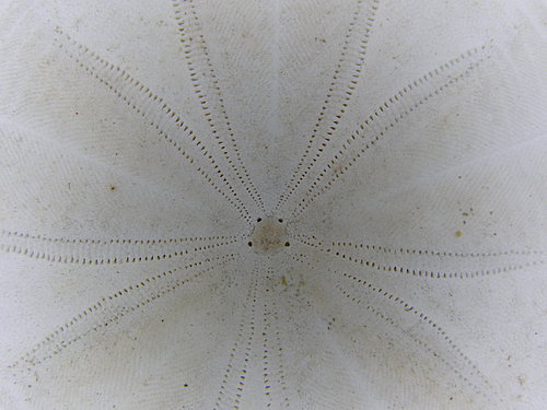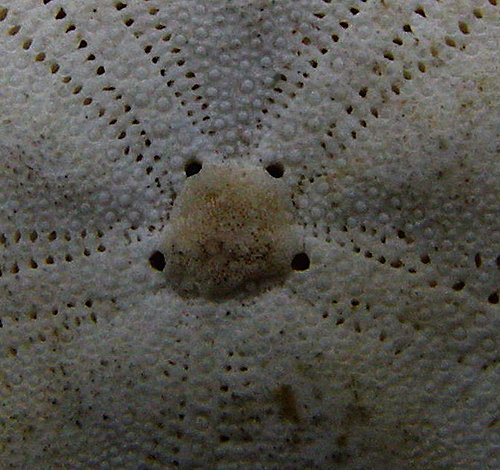 Arachnoides placenta, 扁平蛛網海膽, Periproct (肛圍) & Anus (肛門). Combed areas (梳狀區) present (alternating rows of aligned accessory pores and tubercle rows)