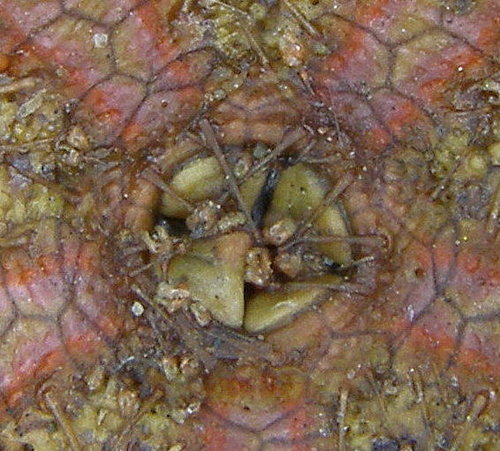 間步帶區中央裸露處中度寬廣,邊緣處稍微呈鋸齒狀,呈紫色帶狀,中央有鋸齒狀淡紫色線從生殖板往下延伸至赤道區上方,而其外緣有紅色帶狀包圍,並一直往下延伸至殼體口面。