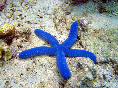 形態特徵: 最常見的大型海星,腕長可達15公分左右。一般個體有5隻腕足,偶有四隻腕足的個體,體色呈淺藍色或寶藍色,但偶有呈紫藍色或橙黃色的個體直徑約16~40公分。腕足細長呈指狀,長短不等,外半段常略膨大。反口面骨板很多,為大小不一的圓或橢圓形,排列無規則。本種是熱帶珊瑚礁內常見而著名的海星,牠們通常出現在礁岩及珊瑚礁區的潮池或亞潮帶水深數公尺的淺水處,潛水時經常可見牠們在沒有掩蔽物的礁石上,將胃外翻消化底質上的藻類及其它有機物。