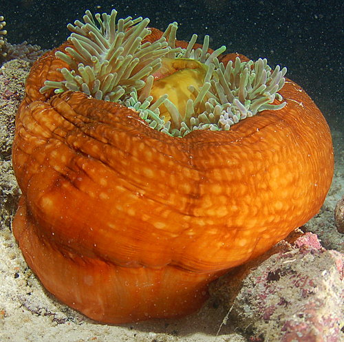 形態特徵: 是一種色彩極為鮮麗多變的海葵,其柱體常呈紅色、粉紅或紫紅色,觸手則呈褐、綠、藍或紫色。整株海葵的直徑可長達1公尺,在眾多海葵中算是比較大型的種類。觸手自基部到末端的直徑相當,呈直筒狀。 觸手較基部處與口盤同色(通常為棕色系),靠末端部分則呈黃色、綠色或白色;某些觸手會分叉或旁支。最內圈觸手距口部僅2~ 3公分。口盤中央呈黃色、棕色或綠色,直徑可超過一公尺以上(但一般常見者約300~500mm);延展時呈扁平狀而稍有波狀起伏,上面佈滿手指狀的觸手(長度約75mm);口盤中央呈隆起狀,故口部如同位於一個圓錐體的頂部。觸手末梢有時逐漸尖細或呈鈍的椎狀,有時則會稍稍膨大,碰觸時可能使人類皮膚過敏或留下傷痕。體柱呈圓筒狀,通常呈鮮明而單一的顏色(常見的有藍色、綠色、紅色、白色或栗棕色),外部具有一列列縱走且與體柱同色的半透明疣突。本種收縮時幾乎可將所有觸手全部包入體柱內。 台灣則分布於全島各地及離島的亞潮帶珊瑚礁區。 喜好長在光線、水流較強的海域,有小幅遷移的習性,是許多小丑魚選擇共生的種類。