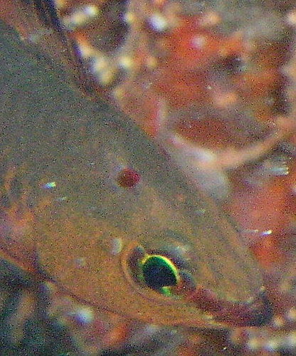 形態特徵: 體長圓而側扁。頭大。吻長。眼大。體為橘紅色到淡棕色,腹部體色有時更淡且略帶銀色;吻部有一暗色短帶,下頜前端亦為黑色;兩側的後頭部各有一較瞳孔為小的黑點,而尾柄中央另有一與瞳孔大小相同的黑圓點;第一背鰭前端呈黑色,第二背鰭基底有黑線,其餘各鰭透明而略帶橘紅色。主要棲息於礁石區。群居性,以多毛類或其它底棲無脊椎動物為食。雄性具口孵行為。