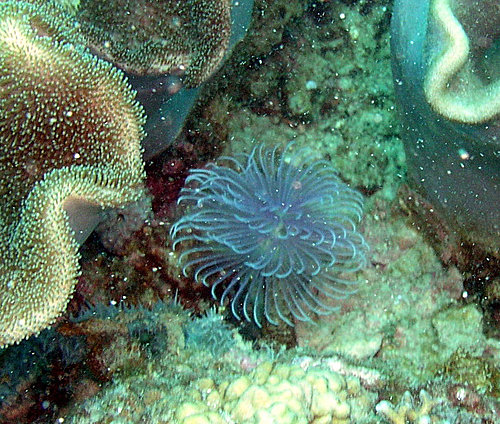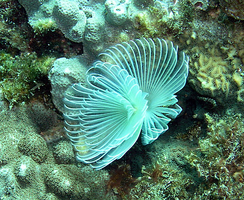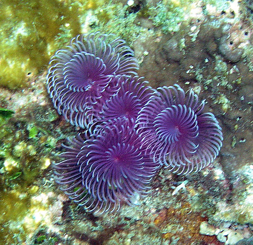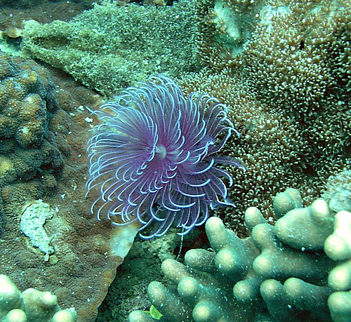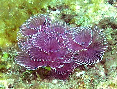 形態特徵: 此蟲會分泌黏液以混合泥沙顆粒、石灰質以築成薄軟皮革質地的泥管並居住於內,此管也是避難的好場所,蟲體隱身於管內,僅露出花朵般的觸手-冠羽鰓部份,其羽鰓具有呼吸及攝食功能,粉紅帶藍色的羽鰓隨著水流於海中搖曳生姿,相當美麗;當外界稍有騷動時,會以迅雷不及掩耳的速度立刻將羽鰓縮回管內以避敵害,待外面平靜後,才會再次將牠們那美麗的羽鰓展現於大海中。此蟲多分布於淺海的岩礁區礁石旁。台灣各地珊瑚礁海域均可發現。