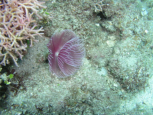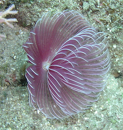 形態特徵: 此蟲會分泌黏液以混合泥沙顆粒、石灰質以築成薄軟皮革質地的泥管並居住於內,此管也是避難的好場所,蟲體隱身於管內,僅露出花朵般的觸手-冠羽鰓部份,其羽鰓具有呼吸及攝食功能,粉紅帶藍色的羽鰓隨著水流於海中搖曳生姿,相當美麗;當外界稍有騷動時,會以迅雷不及掩耳的速度立刻將羽鰓縮回管內以避敵害,待外面平靜後,才會再次將牠們那美麗的羽鰓展現於大海中。此蟲多分布於淺海的岩礁區礁石旁。台灣各地珊瑚礁海域均可發現。