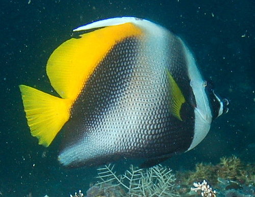 形態特徵: 體甚側扁,背緣高而隆起,略呈三角形。頭短小。體黃白色,隨著成長體色漸暗。體側具2條黑色橫帶,第一條黑橫帶自背鰭起點前方向下延伸至腹鰭,第二條黑橫帶則約自背鰭第VII-IX硬棘向下延伸至臀鰭後部;眼帶明顯,由眼上方向下延伸至間鰓蓋緣;吻部向下環繞一黑色圈。背鰭軟條部及尾鰭淡黃至鮮黃色;胸鰭基部黑色,餘淡黃色;臀鰭前緣白色,後部黑色;腹鰭黑色。棲息於較深的潟湖及面海的珊瑚礁區。多半單獨活動或成小群活動。主要以珊瑚蟲為食。