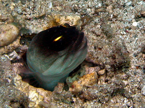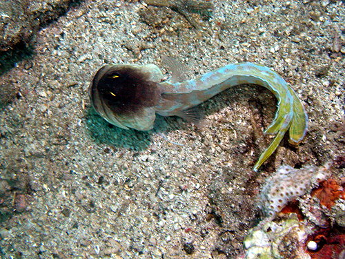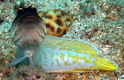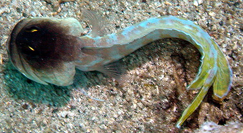 形態特徵: 體延長而側扁。頭大。吻鈍。眼大。口大;上頜後緣尖突, 超越眼後緣後方,且延伸過鰓蓋後緣;頜齒犬齒狀; 鋤骨具小齒。鰓耙數11-12+18-20。體被圓鱗,頭部無鱗;側線不完全,延伸達第3背鰭軟條下方, 接近背鰭基部處。背鰭單一,硬棘部基底較軟條部基底長,鰭條為XI+13-14;臀鰭鰭條為II+14-15;背鰭及臀鰭硬棘皆弱,末端左右不分枝;胸鰭圓形;腹鰭略延長呈尖形;尾鰭後緣圓形。體及頭部呈淡黃褐色,腹面淡色;體側上半部具二條不規則之縱紋。背鰭、 臀鰭及尾鰭暗褐色或稍淡,背鰭基部另具7-9個黑斑塊;腹鰭淡黃褐色而具暗色緣。 主要棲息於沿海石礫底水域,雄性魚有築巢及口孵魚卵的習性。以底棲甲殼類及小魚為食。