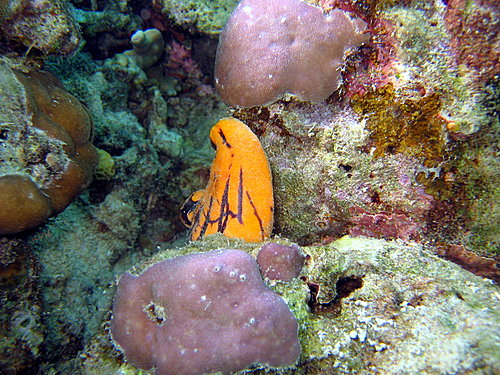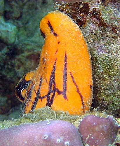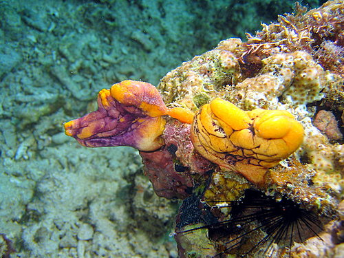 形態特徵: 海鞘外觀與食性上看起來很像海綿,故常會被誤認為植物,但在分類上其實牠是一種脊椎動物,與魚類較為親近,驚訝吧!牠在分類上屬於尾索動物亞門(Urochordata),其下有3綱︰尾海鞘綱(Appendiculariae)、海鞘綱(Ascidiacea)和海樽綱(Thaliacea),海鞘即屬海鞘綱(Ascidiacea)。海鞘身體呈現壺型或囊型,其體壁即為包藏器官的外套膜,其體壁可分泌一種類似植物纖維素的被囊素。身體頂部有兩個相距不遠的孔,分別為略高的出水口和略低的入水口,以如此的一進一出的機制,過濾浮游生物和有機物顆粒營生的濾食性生物體,並從海水中獲取氧氣與食物。全世界大概1250種海鞘。常見的海鞘有:玻璃海鞘(Ascidia)、有柄海鞘(Styela)、擬菊海鞘等。