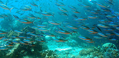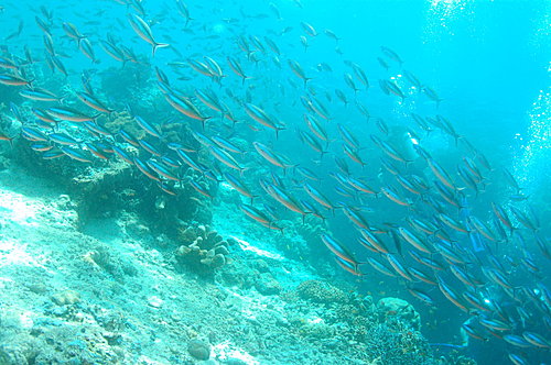 形態特徵: 體呈長紡錘形;標準體長約為體高之3.8-4.4倍。體背藍綠色,腹面粉紅色,體側沿側線有一黑褐色縱帶直行至尾柄背部,並與尾鰭上葉之黑色縱帶相連。各鰭紅色;尾鰭下葉亦有黑色縱帶。主要棲息於沿岸瀉湖或礁石區陡坡外圍清澈海域,性喜大群洄游於礁區之中層水域,游泳速度快且時間持久。屬日行性魚類,晝間在水層間覓食浮游動物,夜間則於礁體間具有遮蔽性的地方休息。