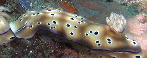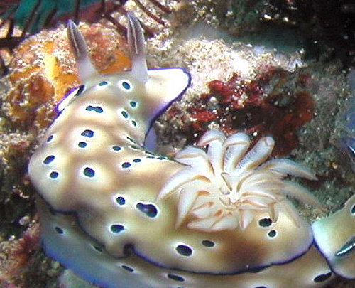 形態特徵: 棕色的身體和白色的腹足。 身體上背部覆蓋著由白色、淺褐色圓形狀包圍的紫色斑點。 其鰓是半透明的白色或者淺褐色的,嗅角(rhinophores)為棕色、暗褐色並覆蓋白色的線條。 它的套膜邊緣有一條薄薄的藍或紫色的線。