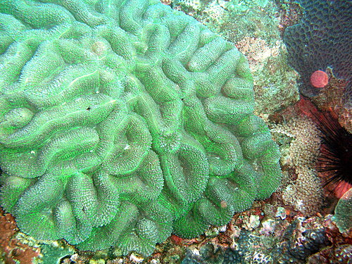 形態特徵: 珊瑚體呈寬闊的腦紋形,紋溝寬約3.5公分,每一個紋溝內有一或兩個聯合的珊瑚石中心,相鄰紋溝間以壁相隔;隔片厚薄不一,邊緣密佈粗大的鋸齒狀突起;生活群體為藍、綠、棕或混合的顏色。常見於珊瑚礁外緣的斜坡上。
