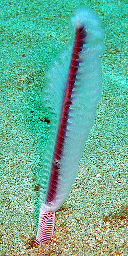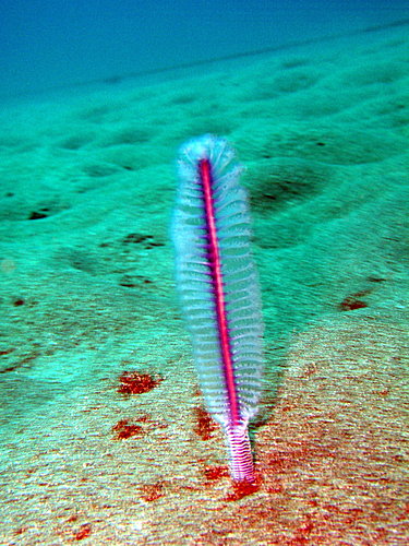 形態特徵: 海筆和珊瑚一樣,隸屬刺胞動物門,它是八放珊瑚中極為特化的一類,最大的個體可高達一公尺。由於外形和中世紀所使用的鵝毛筆相似而得名。在其構造上有一根中軸柱,外層則為水螅體所組成的肉質部份,平時他的一部份體幹埋在泥砂底下,只露出十餘公分在外,當受到騷擾時,所有體幹即縮入泥沙中。其羽毛狀的水螅體以捕捉海水中的浮游動植物為食。其棲習環境僅見於海底的沙泥底質上。