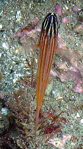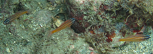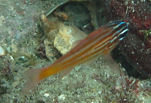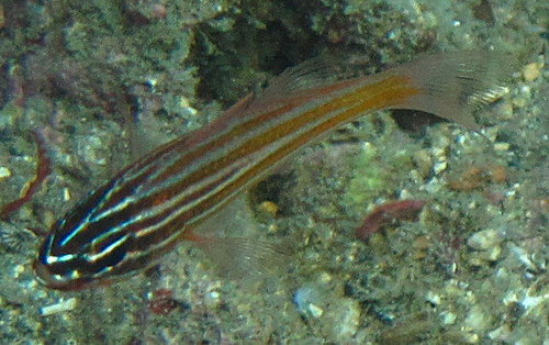 形態特徵: 體長圓而側扁。本種魚為常見於日本、台灣,以往均被誤鑑為金線天竺鯛(A. cyanosoma)。唯本種之發育完全之鰓耙數少於金線天竺鯛(17-21 V.S. 22-23);體側上縱帶之寬度明顯地比金線天竺鯛寬;以及中央之縱紋在尾柄上之末端仍為縱線。主要棲息於礁石區。群居性,以多毛類或其它底棲無脊椎動物為食。台灣分布於南部、小琉球及北部等。