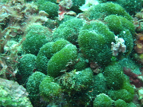 形態特徵: 藻體深綠色,海綿質,圓球狀,隨著藻體成長,表面會逐漸形成凹凸狀,直徑可達4公分。藻體腹面可產生絲狀假根以附著基質上。藻體內部由許多分枝管狀多核細胞交織構成,側生的囊胞為棍棒形,頂端截形或稍圓,直徑300~700μm,具1~5條毛狀突起,囊胞圍繞在髓部周圍緊密排列形成光合作用的柵狀皮層。囊胞中央有一大液泡,葉綠體盤狀,不含澱粉核。生長於水流較平靜的九孔池中或潮下帶2~10米深的岩礁上,幾乎全年均可見。尤其在龍洞灣、大香蘭及卯澳灣等處常聚集成一族群。
