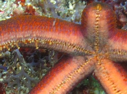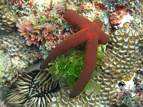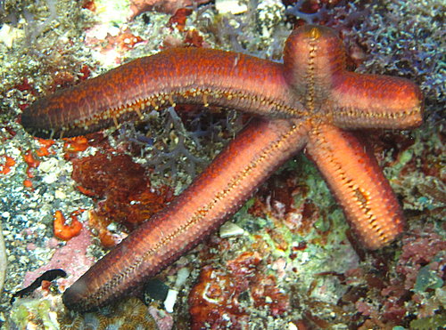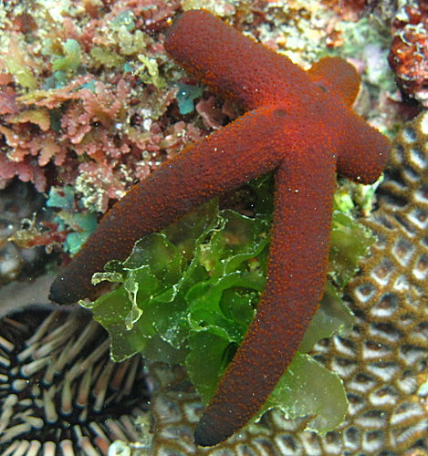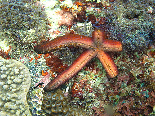 形態特徵: 體色多變異,有橘紅色、黑色、深褐色等,腕長約8公分,棲息於珊瑚礁上,再生能力強,可藉由自割行無性生殖,能夠以單隻斷腕長成完整的新海星,偶見不明原因的畸型個體。腕足狹長從本體向末端微尖,數目為4~7隻,通常為5~6隻。反口面有許多細小棘刺突起,體色隨各棲息地有極大的差異,通常有一截深褐色腕尖。台灣東北角之個體有紅棕色及橙紅色兩型,他地則有土黃色及黑色的品種。在大陸西沙群島與海南島南方是常見的海星種類。