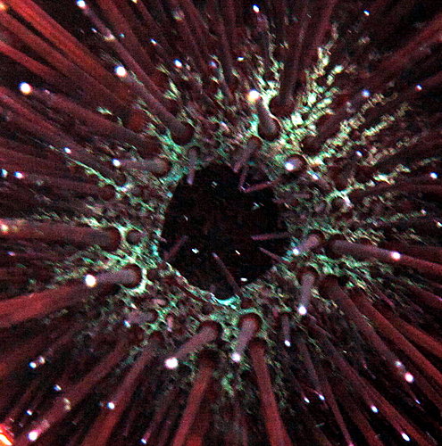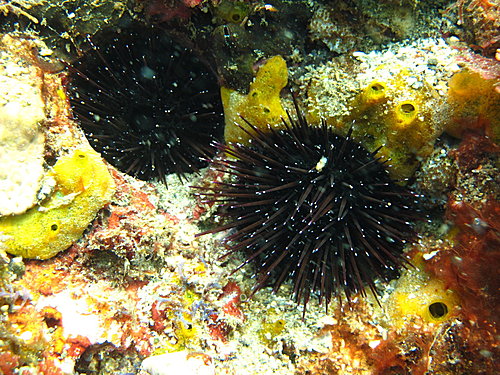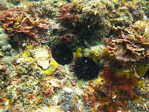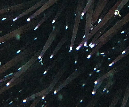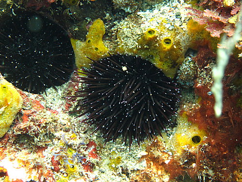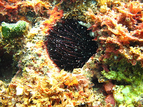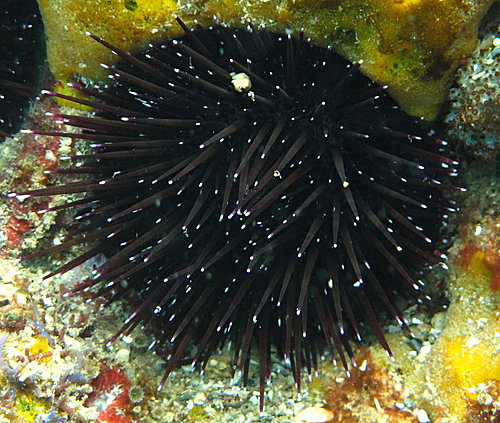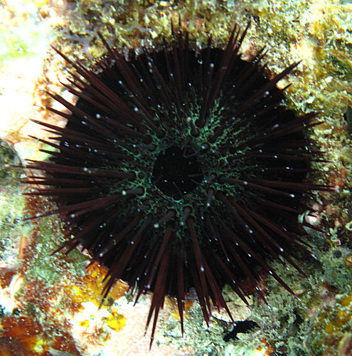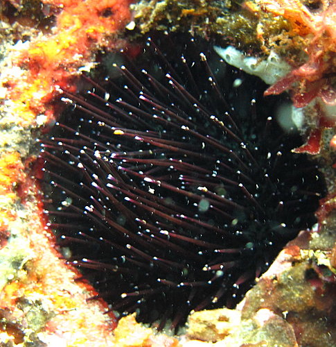 形態特徵: 分布深度約0~50公尺,喜歡活動於岩礁區亞潮帶。整體而言,此種海膽本體及棘刺均呈紫黑色,棘刺細尖而長短不一,末端皆為白色。會掘穴而居,穴居時僅露出一小截棘刺,潛水者若不注意常會踩傷。體型不大,體殼直徑約3~4公分, 但是其成熟個體較紫叢海膽大些,屬於植食性的海膽。白尖紫叢海膽在生殖季時偶有民眾採食,生殖季節為7~12月。廣泛分布於印度-西太平洋海域;在台灣則是分布於北部礁岩海岸。