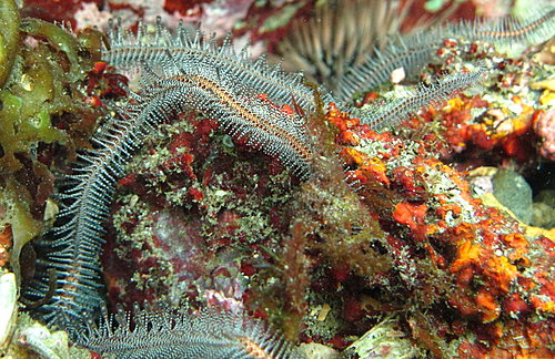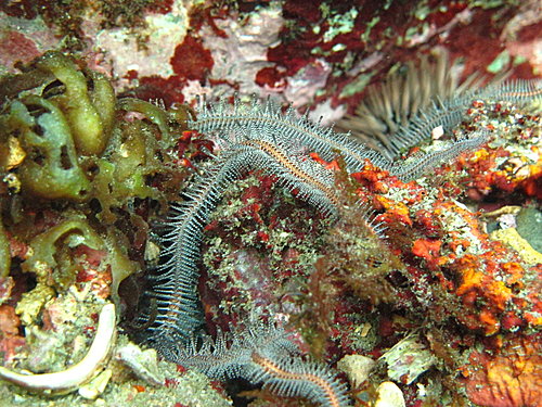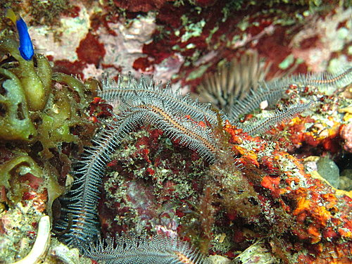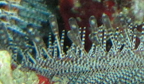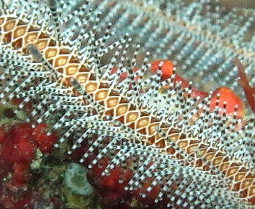 形態特徵: 在水深20公尺以內的珊瑚礁區潮池中極為常見。其反口面為棕紅色,體盤上有許多黑色斑點,牠們的腕足上有十分美麗的菱形格狀花紋,每隔一小段距離便有一對末端膨大如棒球棍般的足針,造型十分特殊搶眼。牠們的體盤為圓形,直徑大約為2.5~3公分左右,但腕長可達25公分,腕共有五隻,十分細長且易斷,在野外通常僅看得到牠們伸出長腕在捕捉水中的有機顆粒,很難見到牠們爬出石縫外。許多人嘗試要一窺牠們的廬山真面目,但往往是將牠們的腕足給拉斷了,卻看不到其體盤真正的形狀。