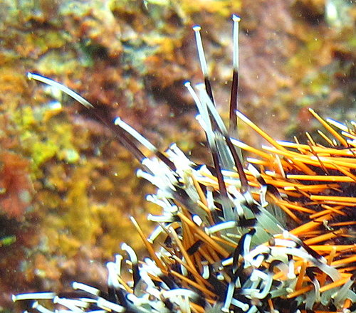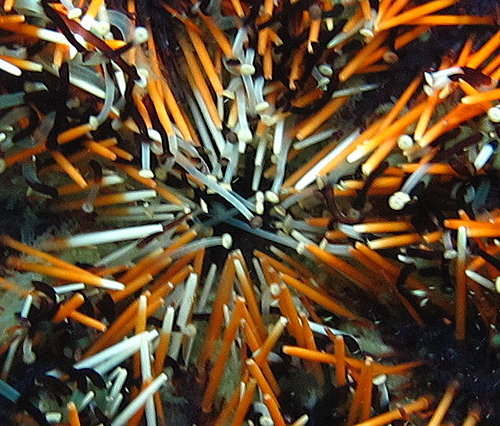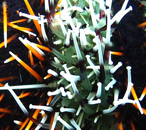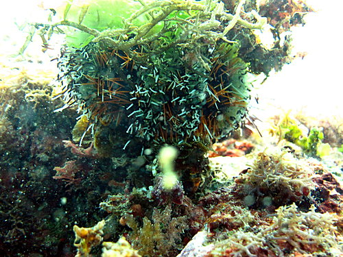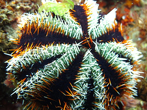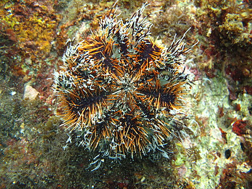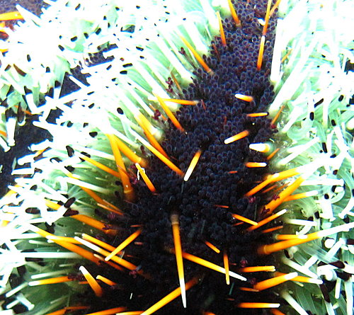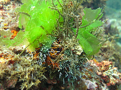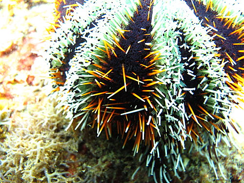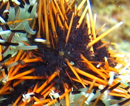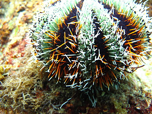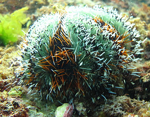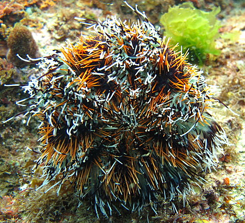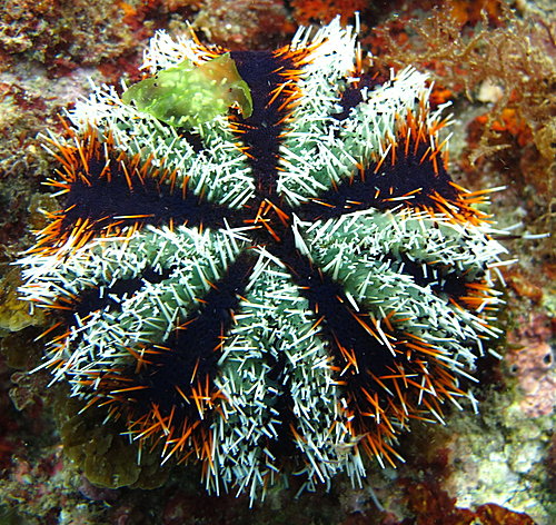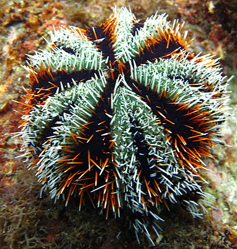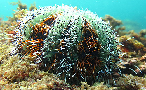 形態特徵: 生活於珊瑚礁區及礁石區,常見於潮池及沿岸水深約10公尺以內的較淺水域(在小琉球地區常見其出現於海草叢中)。本種為大型海膽,成體體殼直徑可達12公分左右,體高達5~ 6公分左右。間步帶的大疣在赤道部排列為6~8個不整齊的縱行,大棘細而短,末端較鈍,不易傷人,顏色一般則為白色或橙紅色。反口面的大棘短而尖銳,長約1公分,表面有細橫紋;口面的大棘則稍鈍。體殼表面常呈紫色 ,但變異非常大。以大型藻類為主食,進食速度快。管足吸附力強,常將海藻、碎木片或垃圾吸附在身上。本種在台灣的生殖季節為8~9月(Chen,1989),其生殖腺可供食用,成熟時肥大味美,日本人將其稱為『雲丹』。