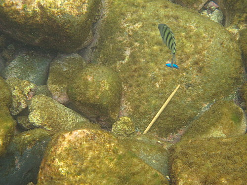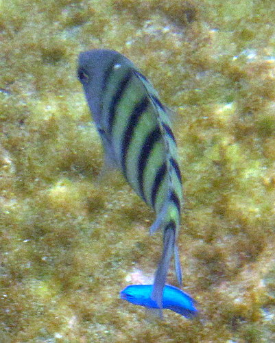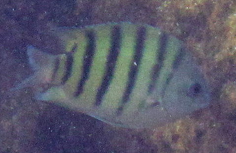 形態特徵: 體呈卵圓形而側扁。尾鰭叉形,末端呈圓形,上下葉外側鰭條不延長呈絲狀。體呈灰黃色或黃褐色,體側有6至7條黑色橫帶,其中第一條位於鰓蓋上方,較不明顯,第七條在尾柄上,有時亦不太明顯。胸鰭基底上方有一小黑斑;鰓蓋骨後緣上方不具黑點;尾柄除黑色橫帶外,無其它黑點。棲息於沿岸較淺的岩礁區,屬雜食性,以動物性浮游生物和藻類為食。大多於礁區上方或中水層成小群體或大群游動,常與條紋豆娘魚 (A. vaigiensisi) 或六線豆娘魚 (A. sexfasciatus) 一起混游。台灣各地海域及離島之岩礁或珊湖礁海岸均有分布。